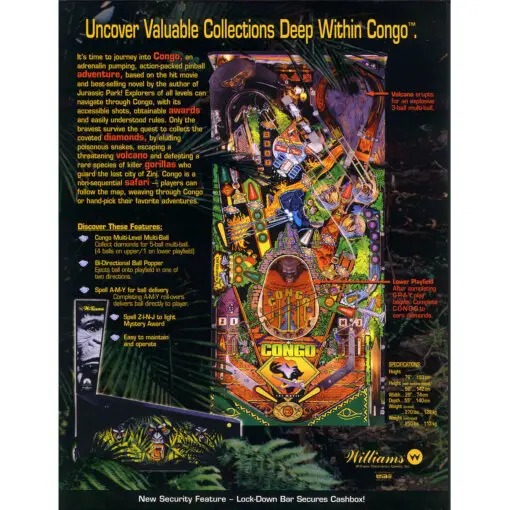 It’s time to journey into Congo, an adrenalin pumping, action-packed pinball adventure, based on the hit movie and best-selling novel by the author of Jurassic Park! Explorers of all levels can navigate through Congo, with its accessible shots, obtainable awards and easily understood rules. Only the bravest survive the quest to collect the coveted diamonds, by eluding poisonous snakes, escaping a threatening volcano and defeating a rare species of killer gorillas who guard the lost city of Zinj. Congo is a non-sequential safari – players can follow the map, weaving through Congo or hand-pick their favorite adventures.
