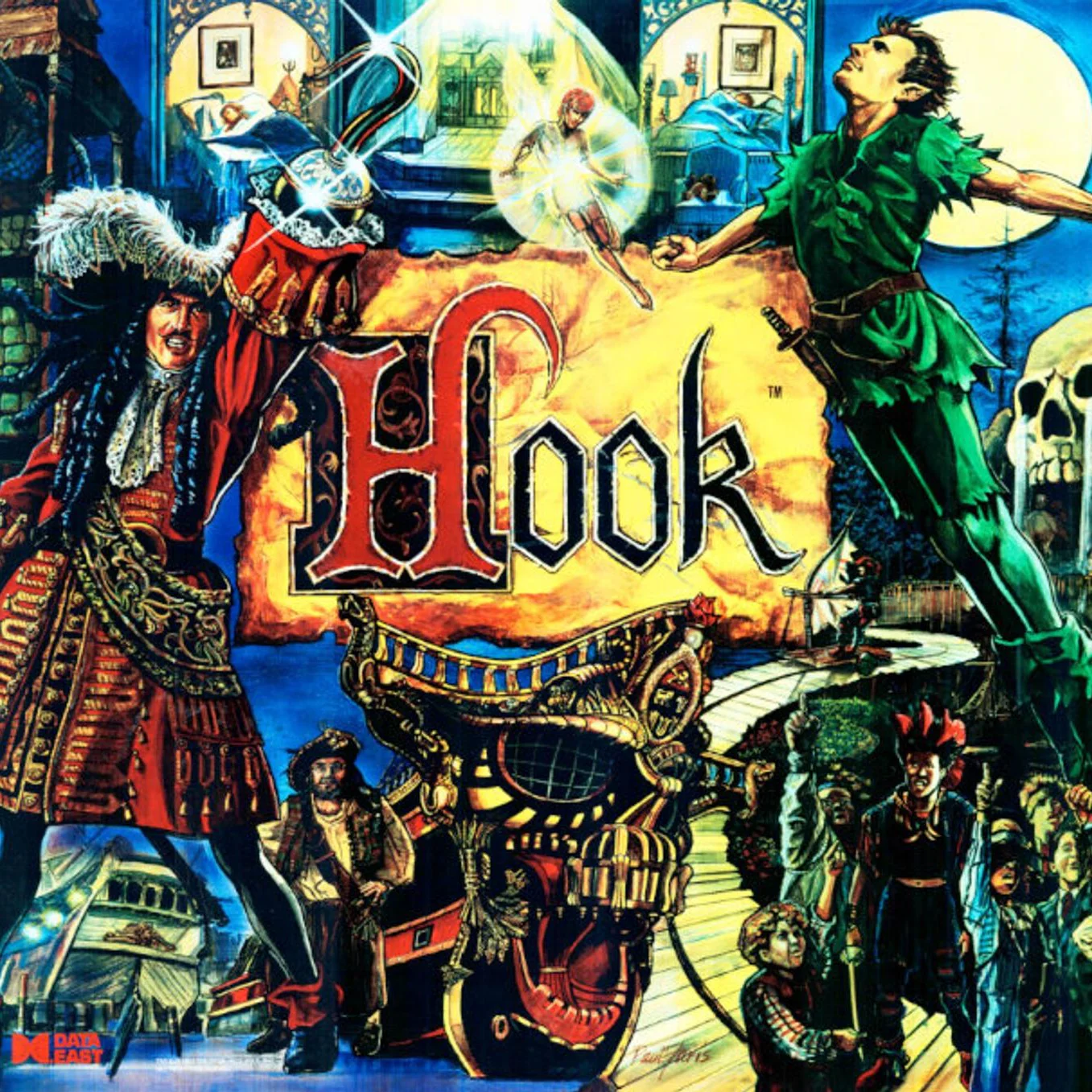 Hook Pinball Machine was manufactured by Data East USA, Inc and released in January 1992. It brings the visibility and appeal of the Hollywood blockbuster film Hook.