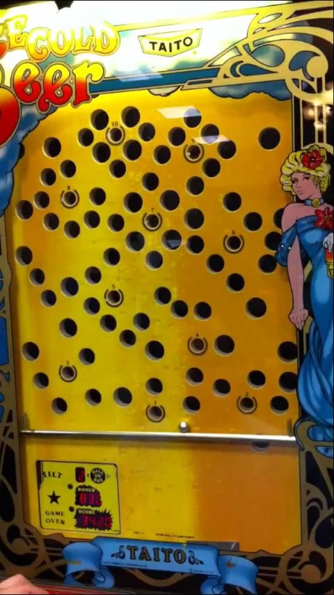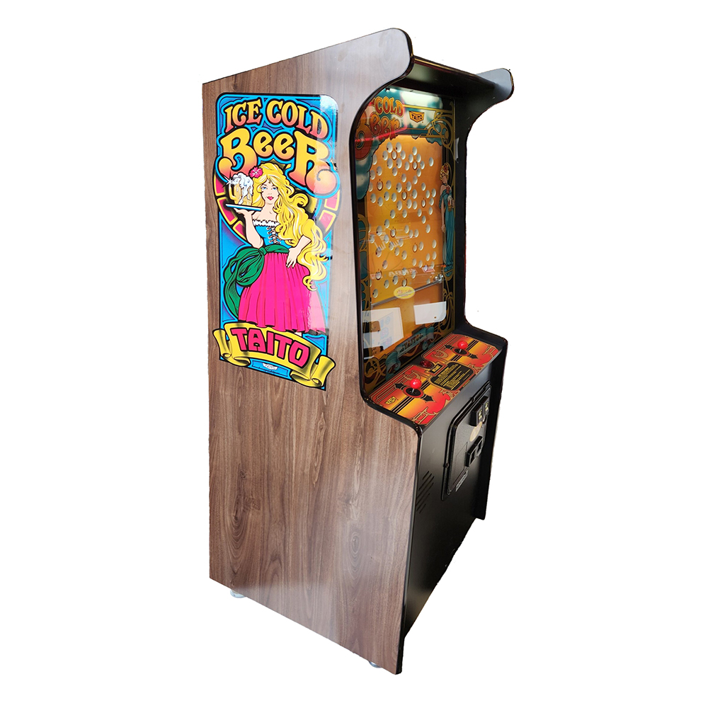 Ice Cold Beer by Taito Arcade Machine is a mechanical arcade game released by Taito in 1983. Ice Cold Beer by Taito Arcade Machine is in a similar cabinet to an arcade video game, but where the screen would normally be there is a vertical wooden playfield dotted with holes.
