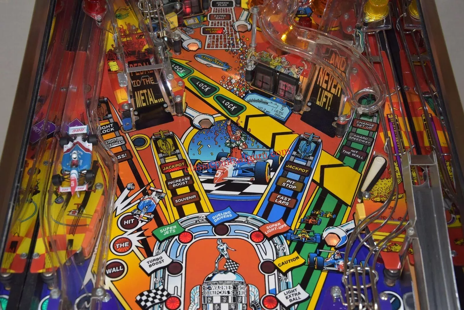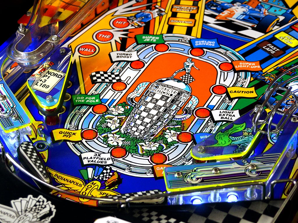 Along the way racers will face challenges inspired by the greatest spectacle in auto racing, and enjoy technology and equipment for peak performance. The unique high-revving Turbo Lock Unit saves balls in its rotating chamber and fires them onto the playfield for two- to four-ball multi-ball action. The model Indy racecar speeds around the mini-track, its velocity increasing with consecutive ramp shots. Players will actually feel the rumble of its high-powered engine. And the Light-up Targets and Pop-up Bumpers add an extra dimension of flash and fun.