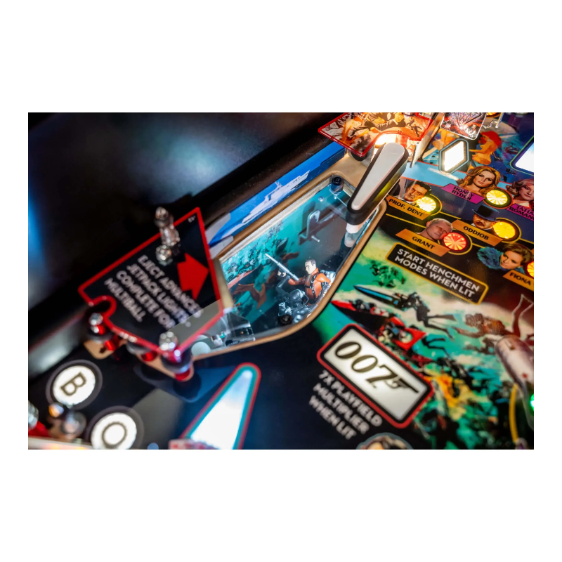 - Custom sculpted fully decorated James Bond action figure with Jetpack; magnetically transports pinballs across playfield