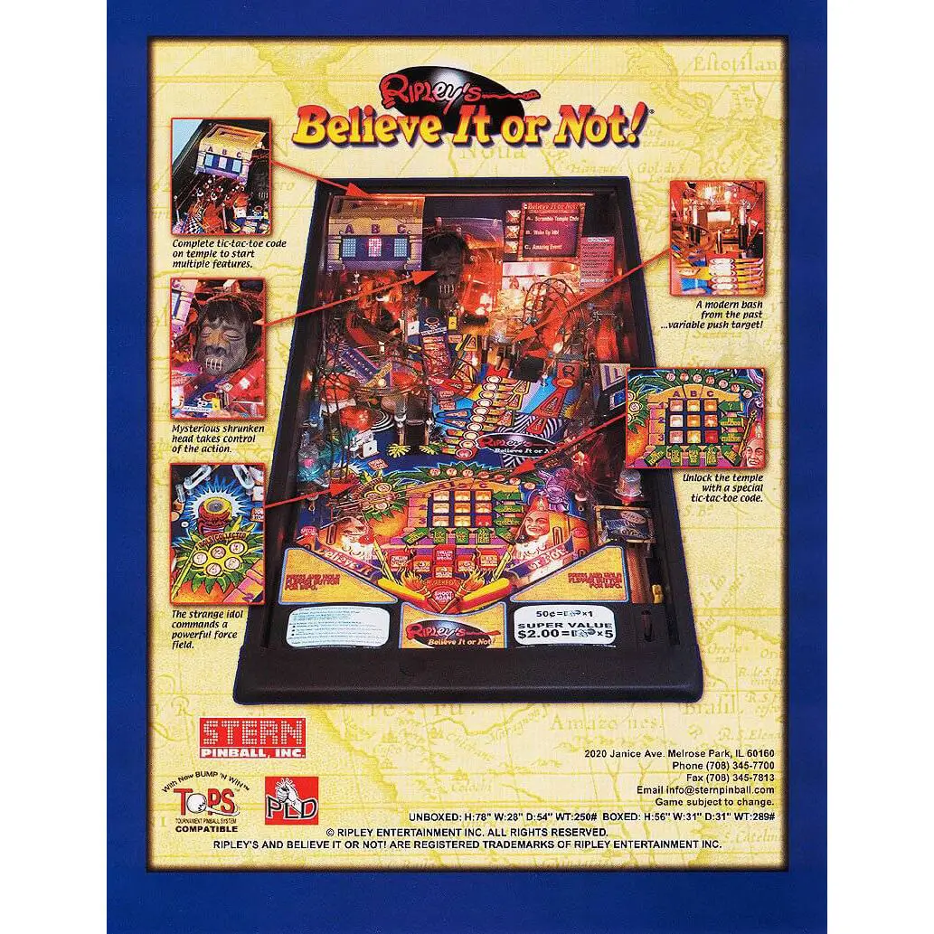 Ripley’s Believe It or Not Pinball Machine appeals to all levels of play through a special feature aptly entitled “Believe it or Not.” The multi-level rule enables the beginning player to achieve some of the game’s goals early on, while it allows the more advanced player to extend their opportunities through better play.