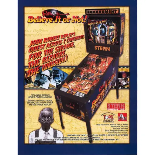 Ripley’s Believe It or Not Pinball Machine by Stern was released in 2004. Ripley’s Believe It or Not! is all about traveling with the legendary Robert Ripley across seven continents to discover the strange, the bizarre, the unusual! Robert Ripley was born in 1890 in Santa Rosa, California. Ripley sold his first cartoon to LIFE magazine at the age of 18, and at the age of 29 the first Believe It or Not! cartoon was published. the strange things Ripley found on his journeys around the world sparked his own Believe It or Not! radio show, TV show, and the famous Believe It or Not! museums. In 2000, a new Ripley’s Believe It or Not! TV show aired, starring Dean Cain.