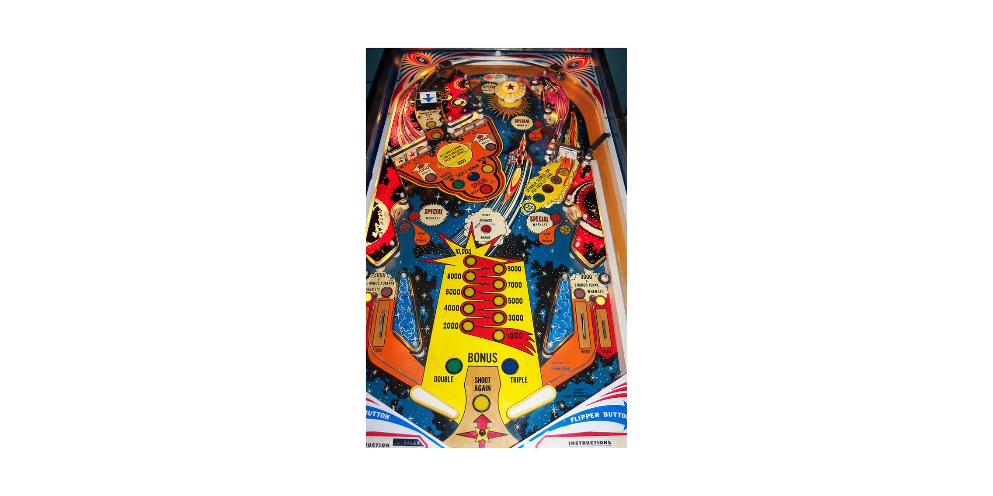Stars Pinball Machine by Stern is n Outer Space – Space Exploration themed game. It is one of two 4-player games made by Stern Electronics that has a switch setting to convert the game to 2-player operation. This is accomplished by setting CPU Switch 25 to its OFF position. Designer Mike Kubin tells us that there were certain markets that wanted only 2-player games, although he could not recall which countries they were. Because the 3rd and 4th player score displays would be disabled for this, and likely were not even installed, Stern made a special 2-player backglass for these games. We do not know how many games were shipped with the 2-player backglass.