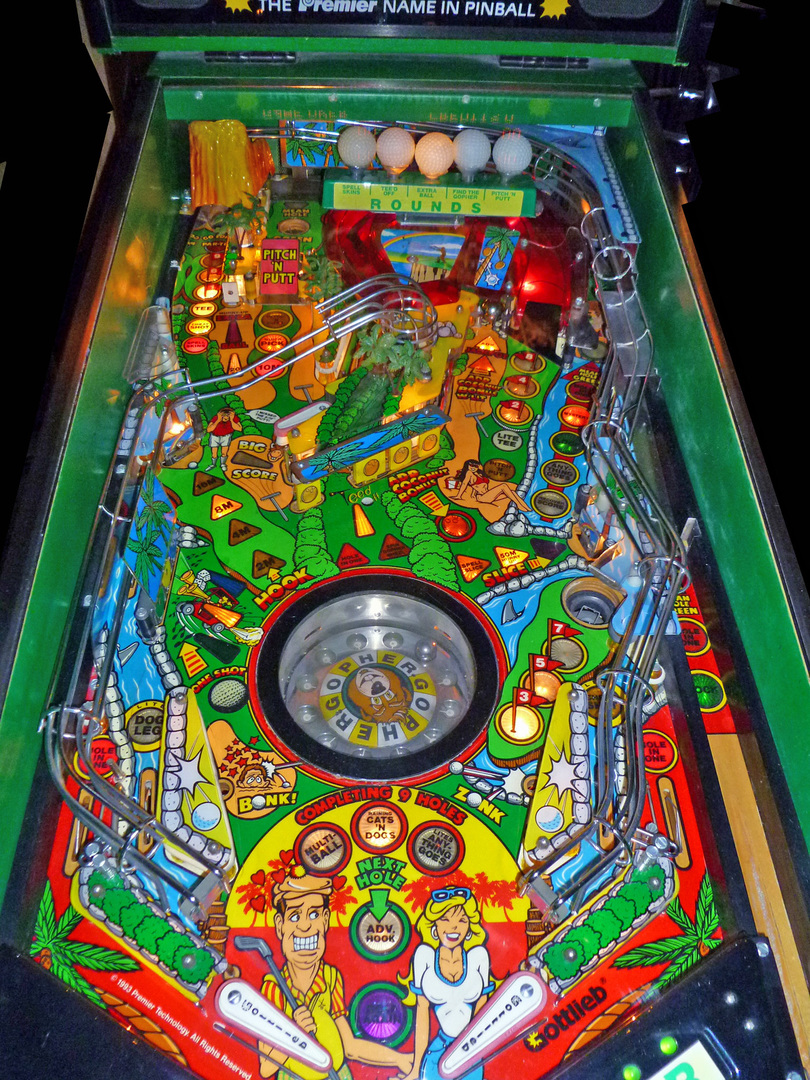 Tee’d Off Pinball Machine is a 1993 sports-golf themed game by Gottlieb. This game features a “Caddyshack” type theme. It has an animatronic gopher named Gunther that shrugs his shoulders in sync with voice during game play and sometimes during attract mode at the top of the backbox, and he mocks the player. Tee’d Off Pinball Machine main objective is to complete all 9 holes in the right order. The game includes a pitch and putt mini playfield and mini-games like find-the-gopher. After all holes are lit an award is given depending on how many times all holes have been completed. There are 5 modes that are started by shooting the volcano when lit. Completing all modes lights the big score target.