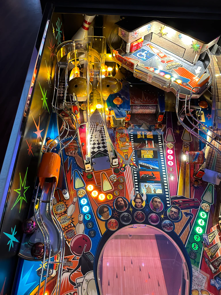 Launch the ball and enter the world of The Dude. More than 200 quotes and clips from the movie, Brunswickâ„¢ Bowling Alley with 10 controlled pins, 3 Flippers and multi-level playfield.