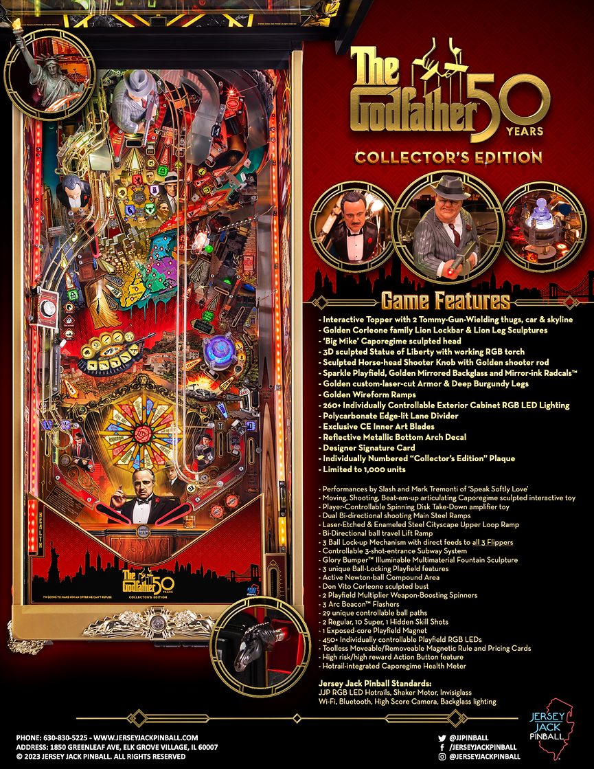 “The Godfather is a cinematic masterpiece that has held it’s place in movie history for over half a century. The Godfather pinball machine captures the essence of the films and offers a unique gameplay experience,” said Jack Guarnieri, Founder, Jersey Jack Pinball. “This game is the ultimate collector’s item.”