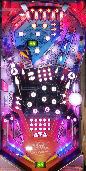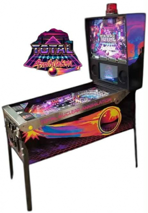 Total Nuclear Annihilation Pinball Machine is a Warfare themed game. Designed by Scott Danesi, the game was manufactured by Spooky Pinball in September of 2017. A total of 550 machines were originally produced.