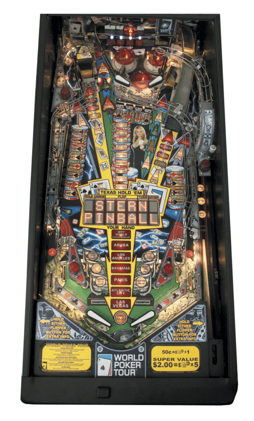 Texas Hold ‘Em poker deals the silver ball another great hand with World Poker Tour Pinball from Stern Pinball. Based on the hit television series that airs on the Travel Channel, World Poker Tour Pinball brings new levels of excitement, challenge, and understandability for both the novice and the skilled player.